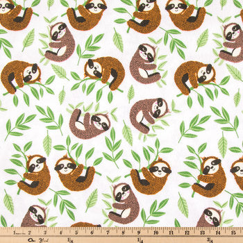 Create a warm and cozy accessory made from this adorable Sleepy Sloths Flannel Fabric. This incredibly soft fabric offers a white background and a pattern of brown sloths on green bamboo branches. Use it to make darling blankets, throws, pillows, burp cloths, and more.