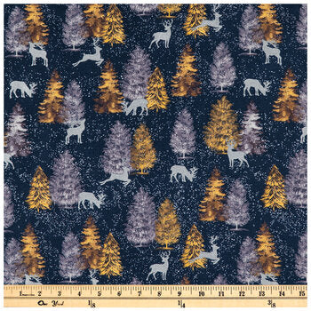 Step into the wonderful world of winter with this Metallic Christmas Trees Cotton Fabric. This lightweight cotton fabric features a navy background with snow falling over sparkly silver reindeer who are either leaping or standing. There are some gold and gray-blue trees throughout the scene. Create something that will leave you jumping for joy!