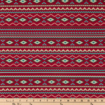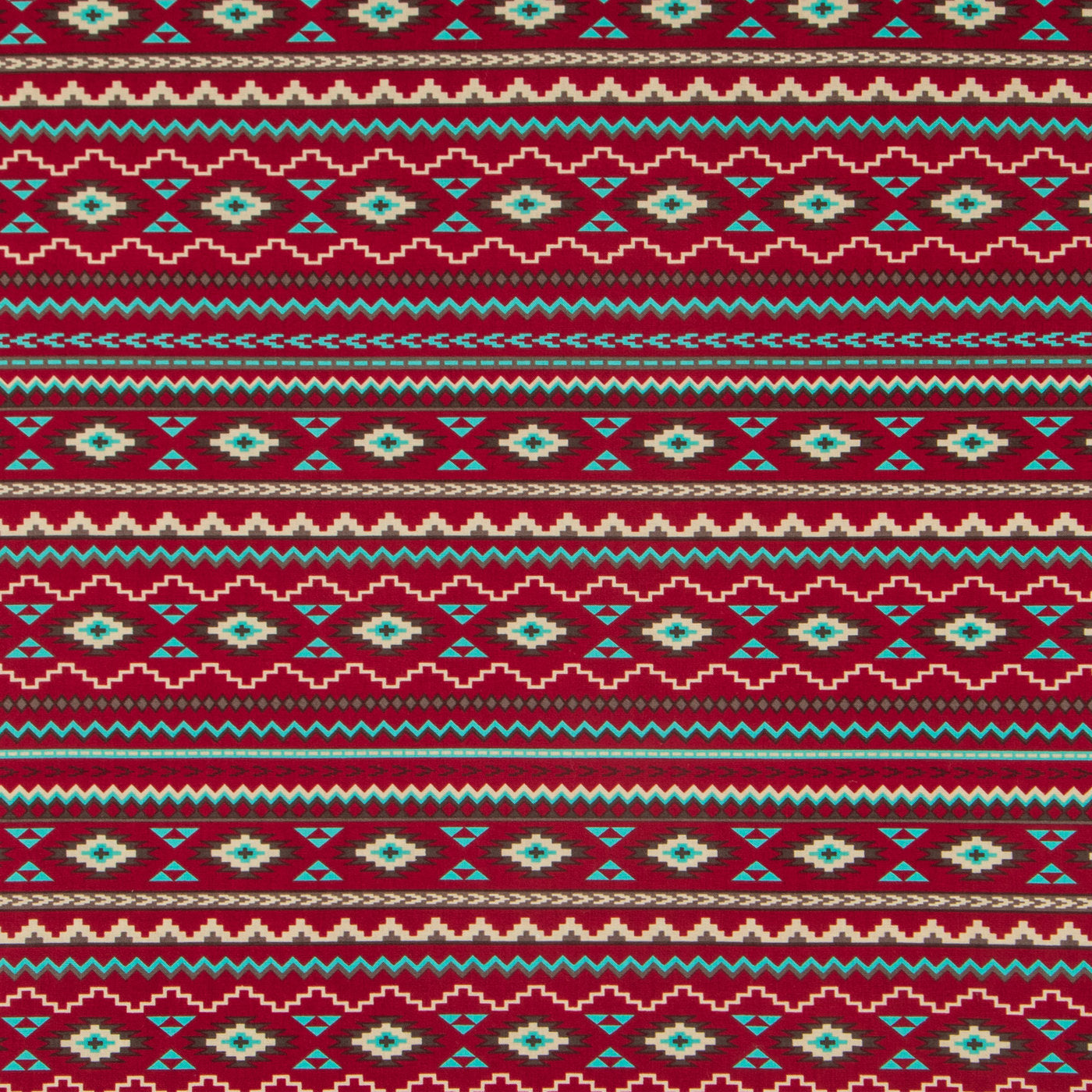 Supplement your impressive sewing skills with a stylish fabric that fits your creative needs! Red Southwest Striped Cotton Calico Fabric features a maroon red background with a southwestern stripe pattern with diamonds, trianges, and chevron stripes in cream, muted brown, dark brown, and turquoise-blue color. This charming fabric can be made into standout blouses, dresses, pillows, purses, and so much more.