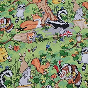 Baby Animals Cartoon Green Forest Cotton Fabric